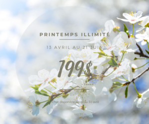 • Le FORFAIT PRINTEMPS ILLIMITÉ est non-transférable et non-monnayable. Il est non-remboursable, sauf dans le cas d’une maladie grave (billet médical requis) ou d’un déménagement (preuve de résidence).